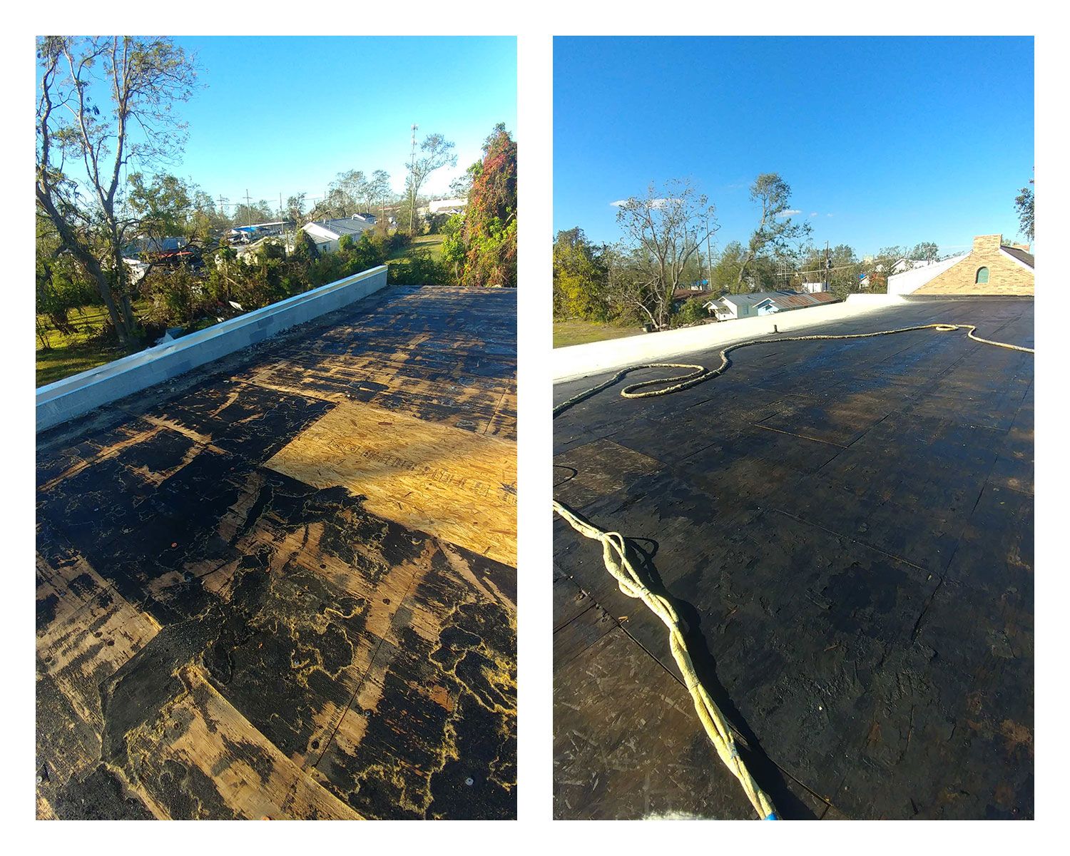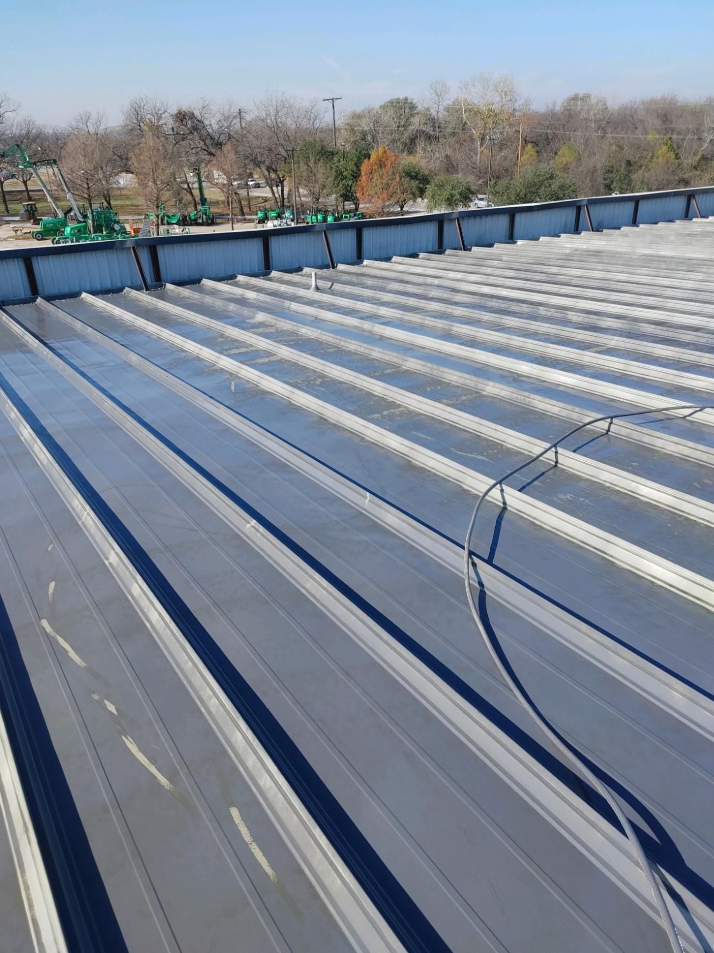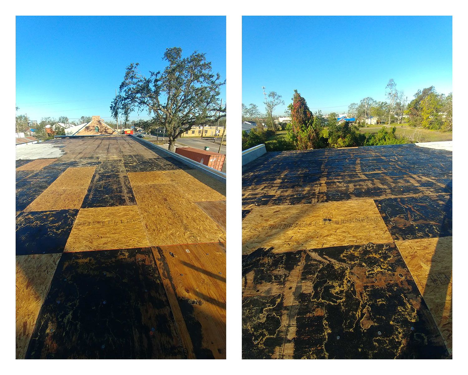 - Install new edge metal on back side of roof and screw plates for wind uplift