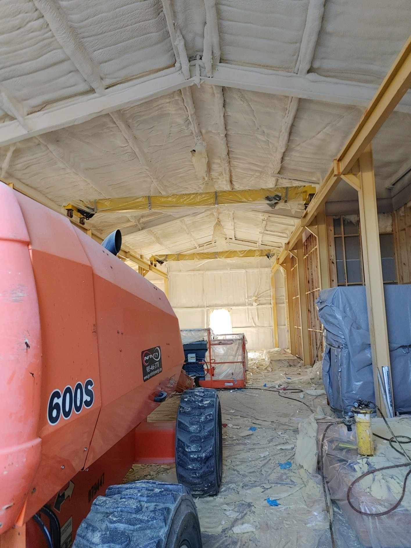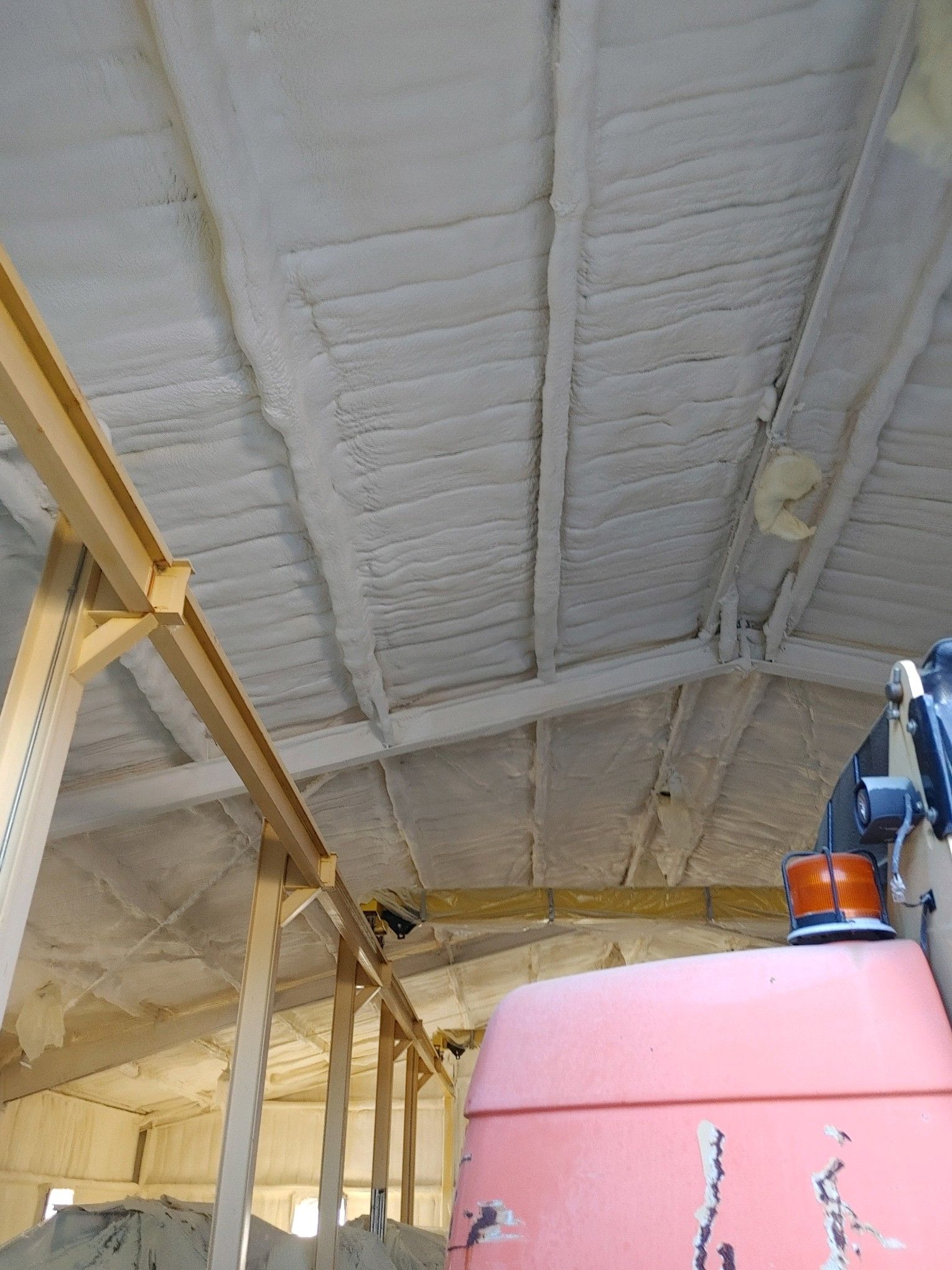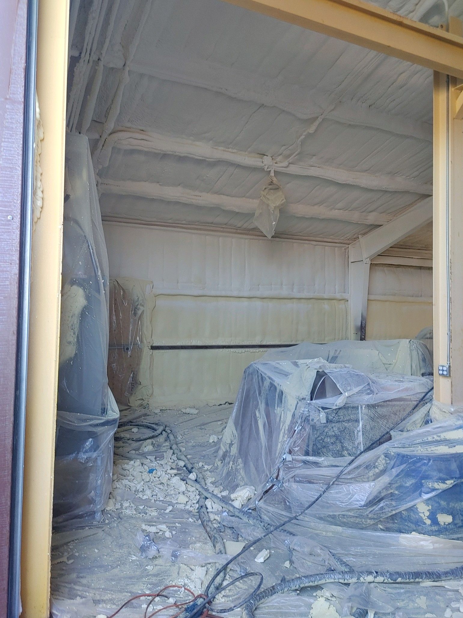 - Spray 1 1/2" Polyurethane foam between wall studs and under roof deck;